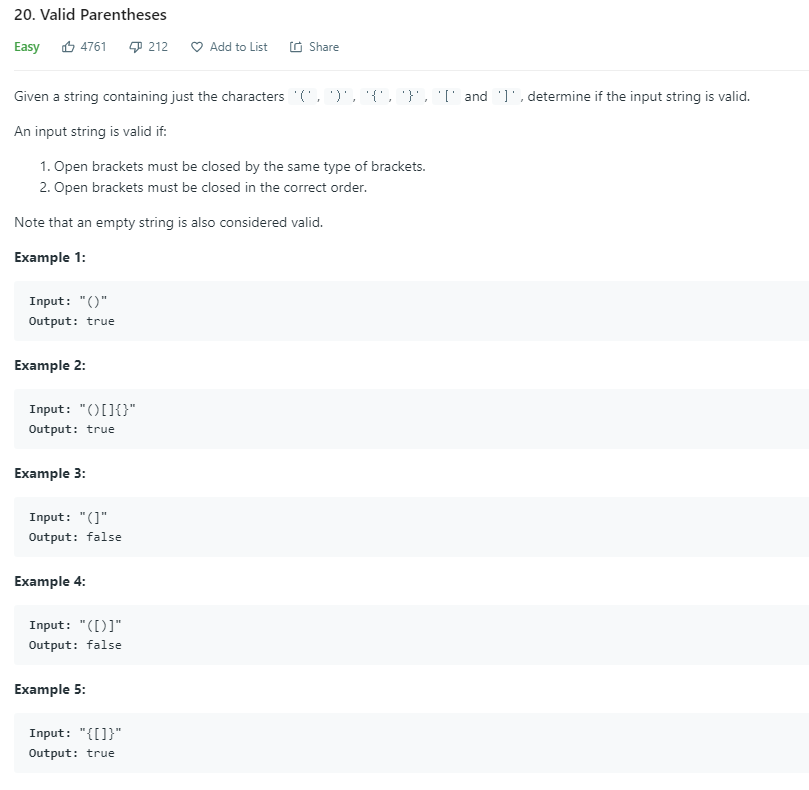 - for문이 끝났는데 stack이 비어있다면 '(', '{', '[' 등이 들어있는 것이므로 페어가 안맞아 false를 반환한다.