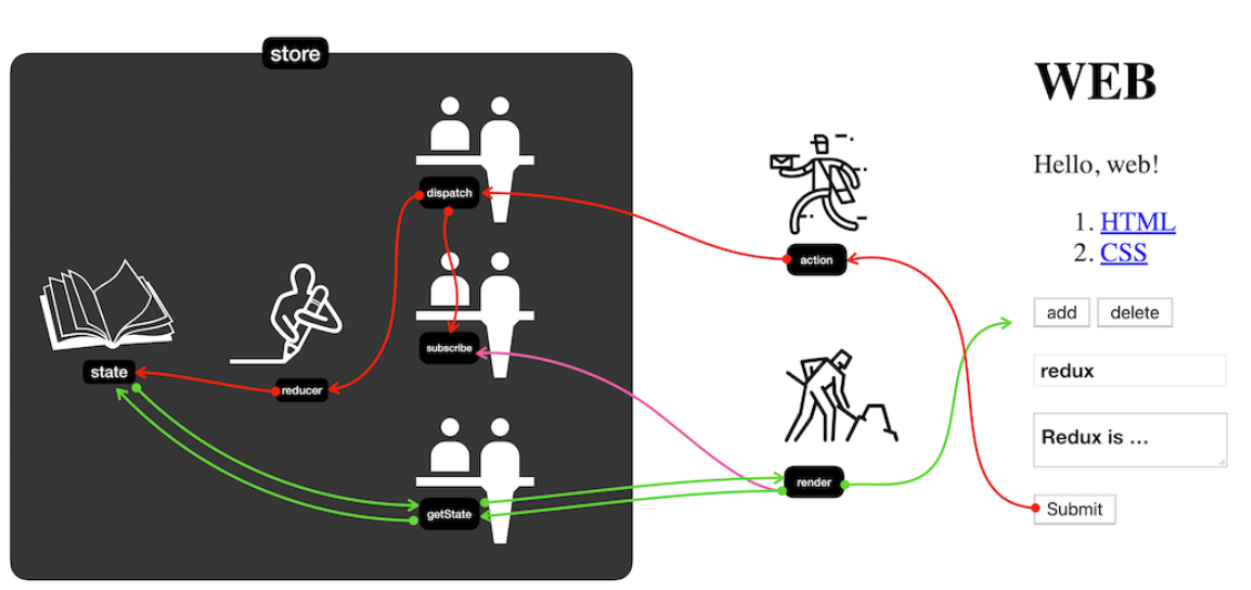 state를 입력값으로 받고 action을 참조해서 새로운 state값으로 리턴해주는 가공자의 역할