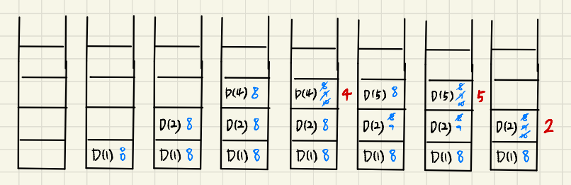 위 그림은 스텍 자료구조에 D함수가 처리되는 과정을 그린 것이며