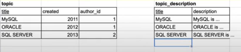 - topic 테이블에 조회가 많이 일어나고 description을 매번 조회하지 않아도 되는 경우 description컬럼과 title컬럼을 따로해서 테이블을 형성함