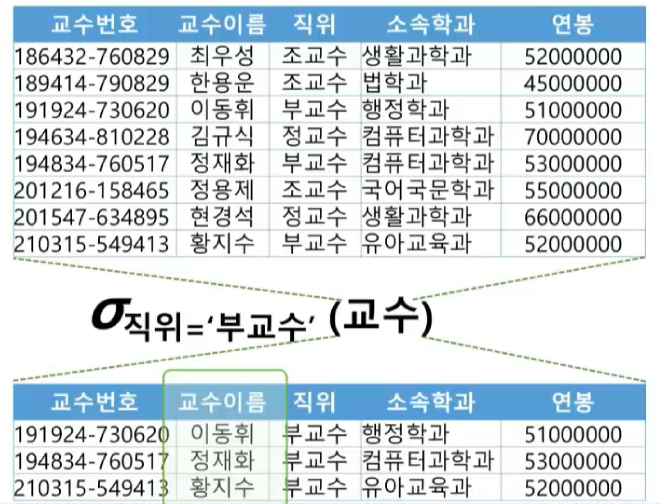 - 주어진 릴레이션에서 조건을 만족하는 레코드를 갖는 릴레이션을 생성