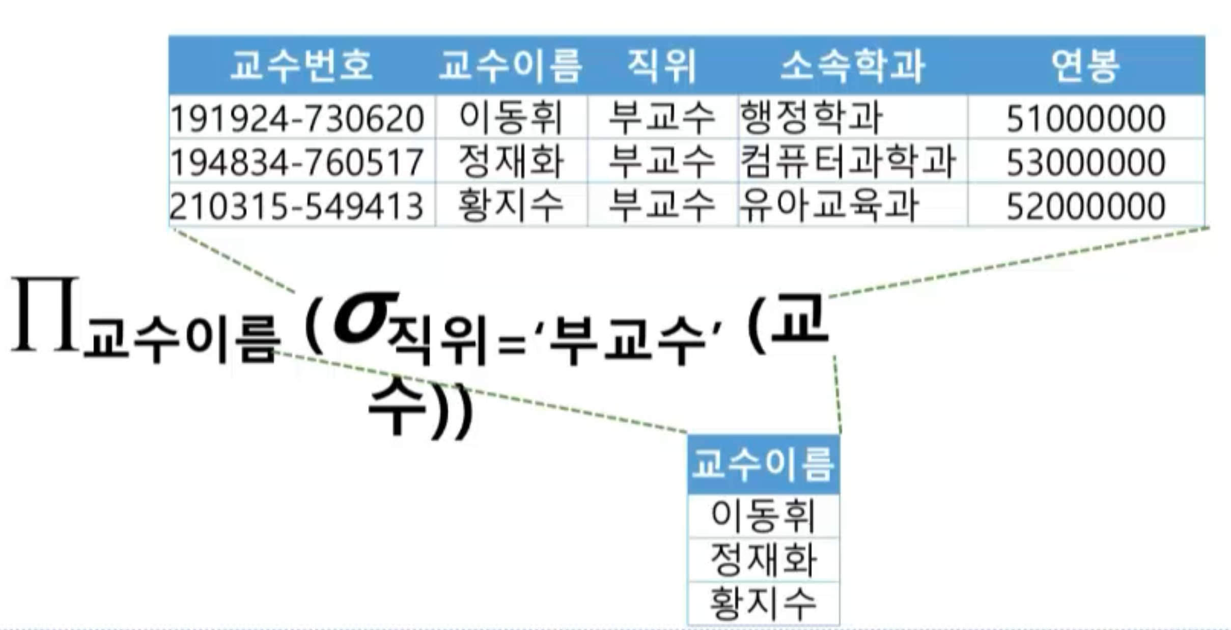 - 관계 대수 연산자는 새로운 임시 릴레이션을 생성