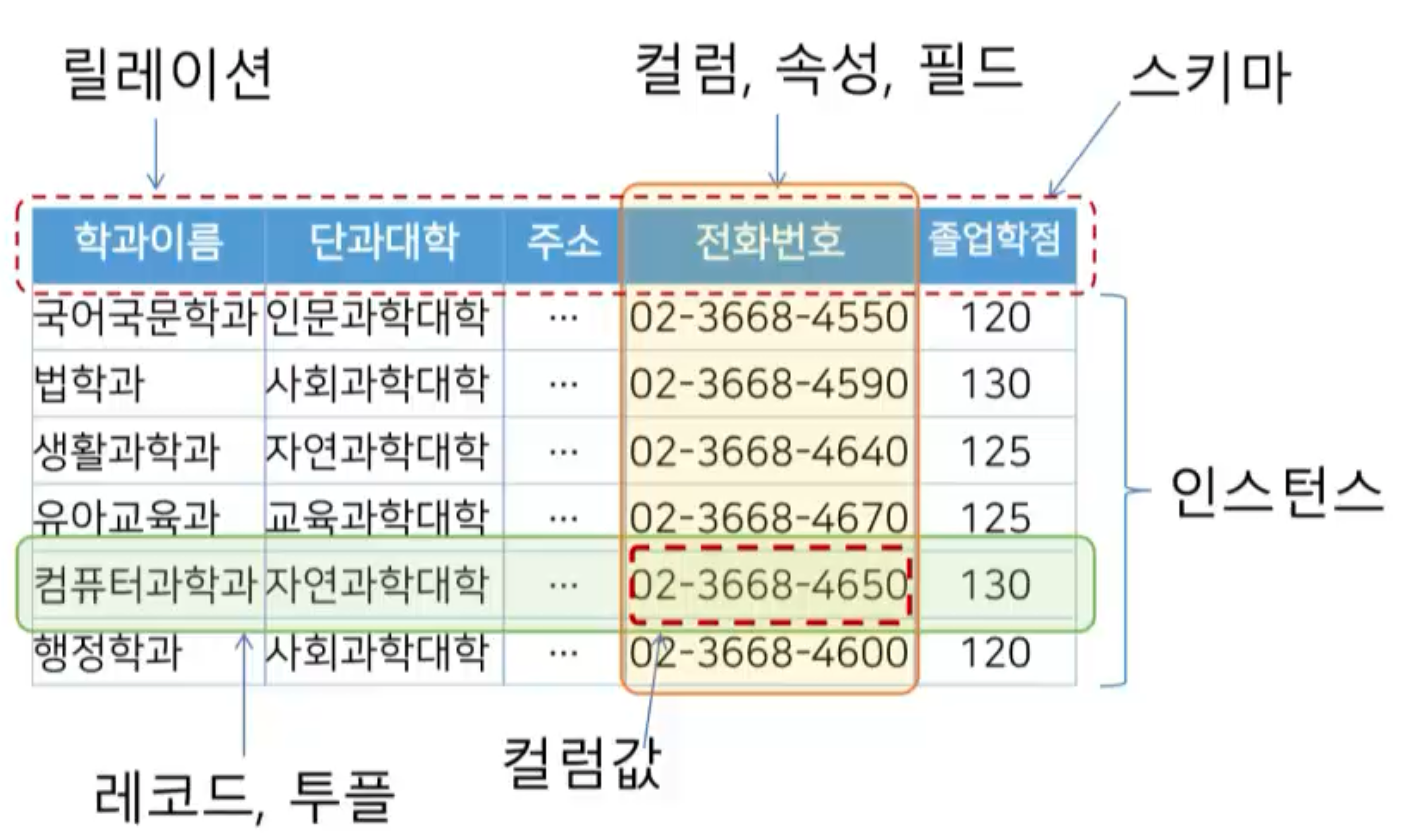 - 슈퍼키: 학과이름, {학과이름, 단과대학}, 주소, 전화번호, {전화번호, 졸업학점} 등