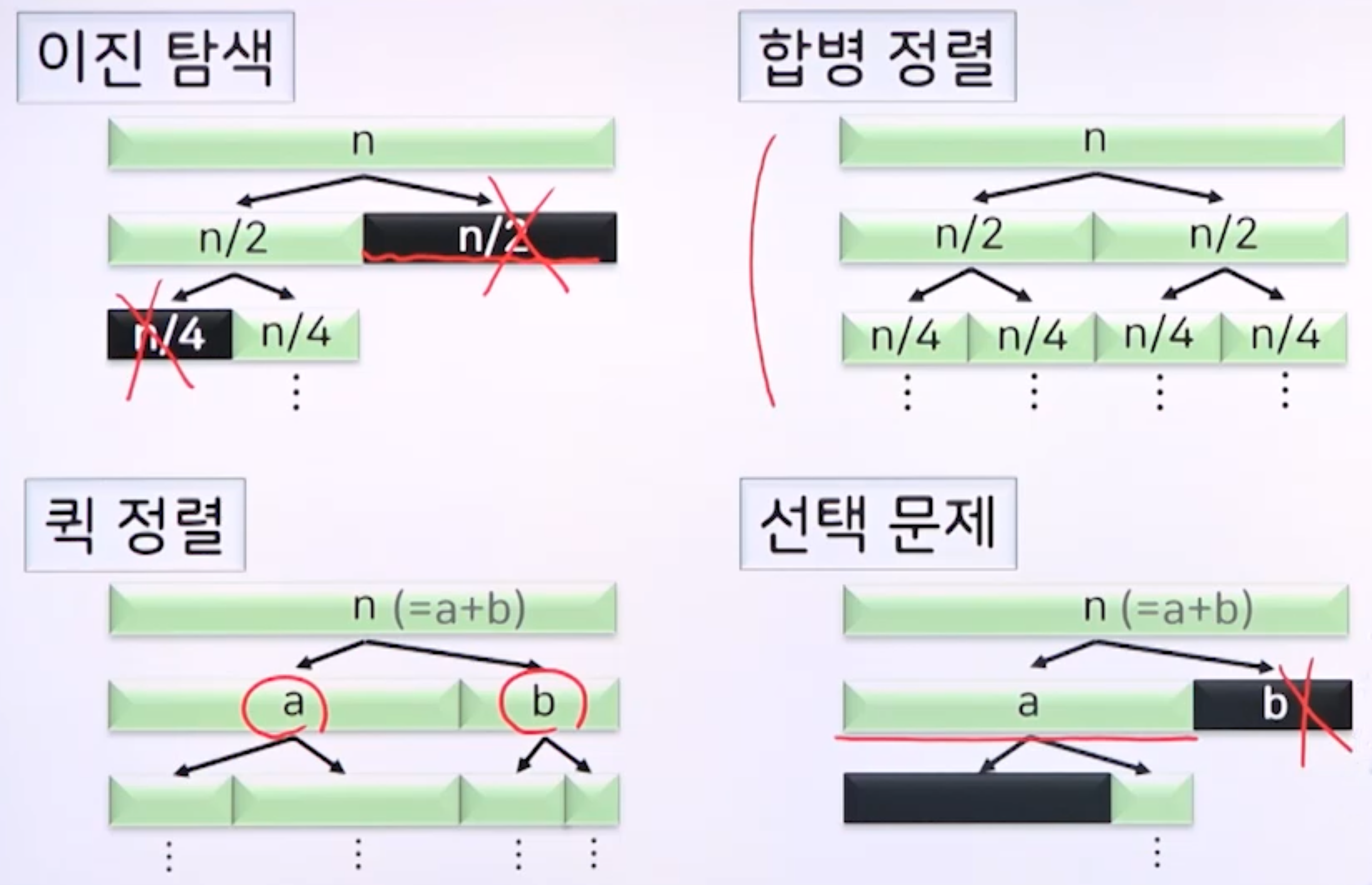 - 주어진 문제의 입력을 더이상 나눌 수 없을 때까지 두 개 이상의 작은 문제로 순환적으로 분할하고