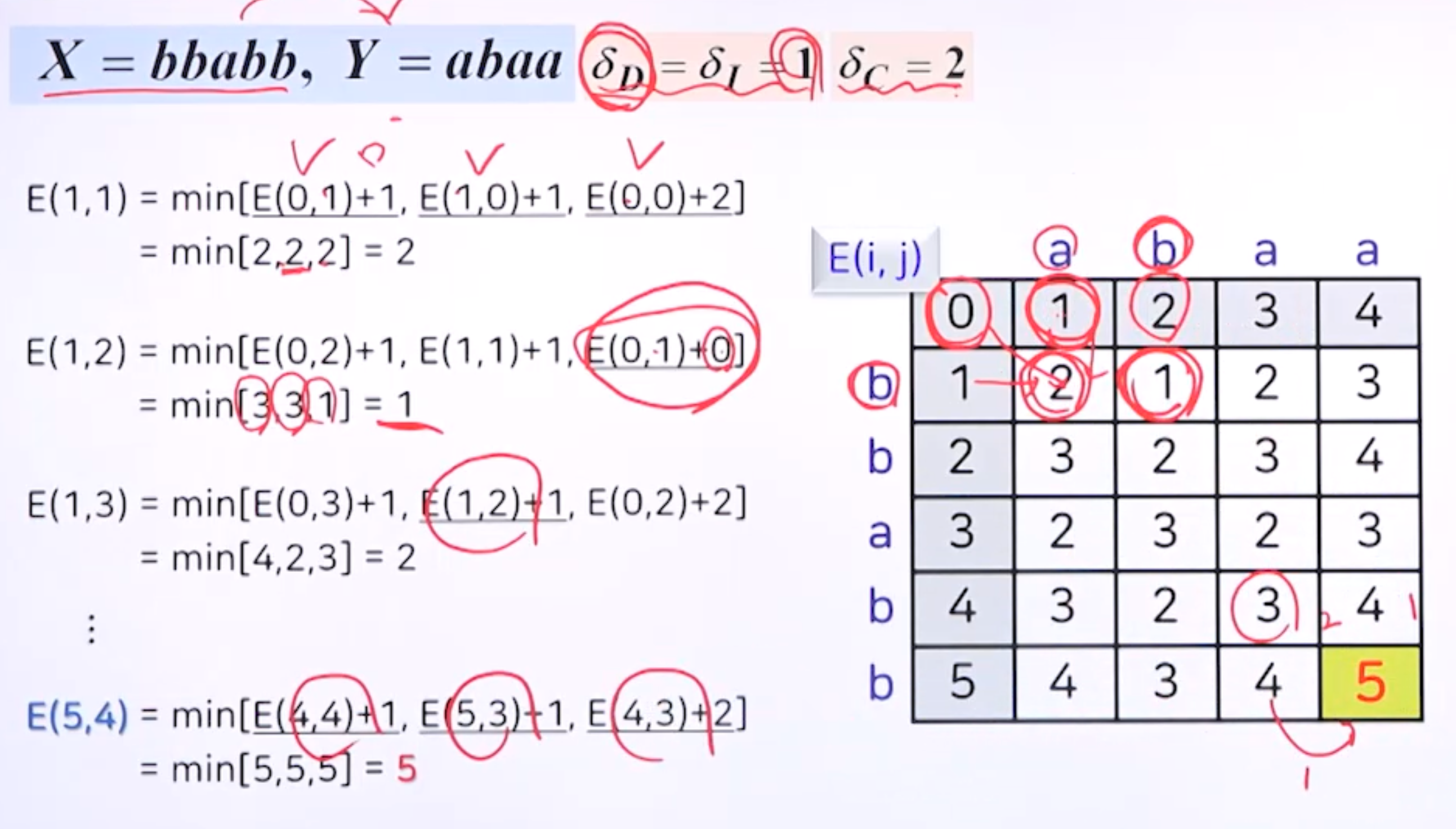 - Xi = x1x2 ... xi와 Yi = y1y2 ... yj 사이의 편집 거리
