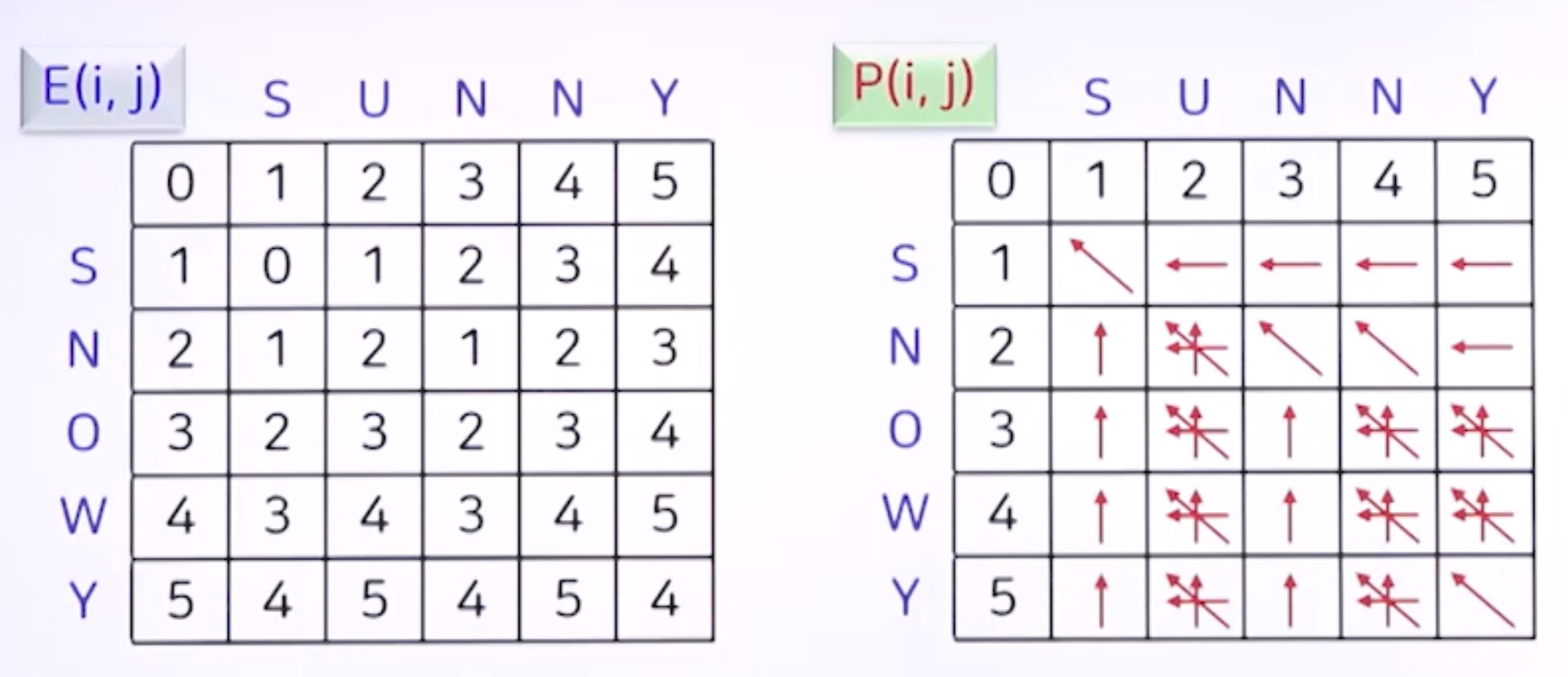 - E(i, j)로 선택되는 최소값이 어떤 연산으로 결정되는 지를 표시