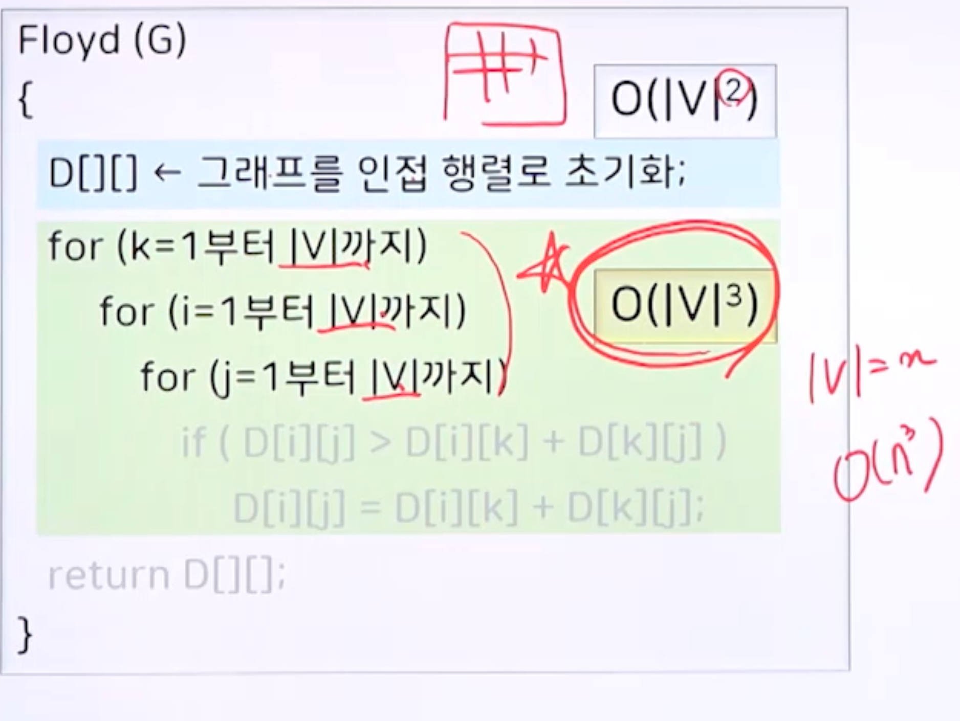 - 경유할 수 있는 정점의 범위가 1인 경로부터 시작해서 |V| 까지인 경로까지 하나씩 범위를 늘려가면서 모든 정점 간의 최단 경로를 한꺼번에 구하는 알고리즘
