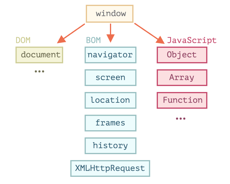 javascript의 모든 객체, 전역 함수, 전역 변수들은 자동으로 window 객체의 프로퍼티가 된다. window 객체의 메소드는 전역 함수이고 window 객체의 프로퍼티는 전역 변수가 된다. 문서 객체 모델(DOM)의 요소들도 모두 window 객체의 프로퍼티가 된다.