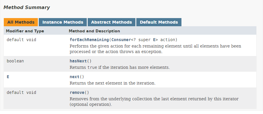- 위에서 설명한 iterator 에서 사용할 수 있는 기능을 사용하고자 하면 Iterator 인스턴스를 생성하고 iterator() 메소드를 통해 접근해야 한다.